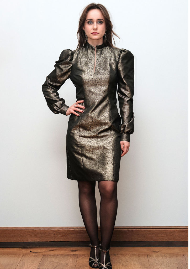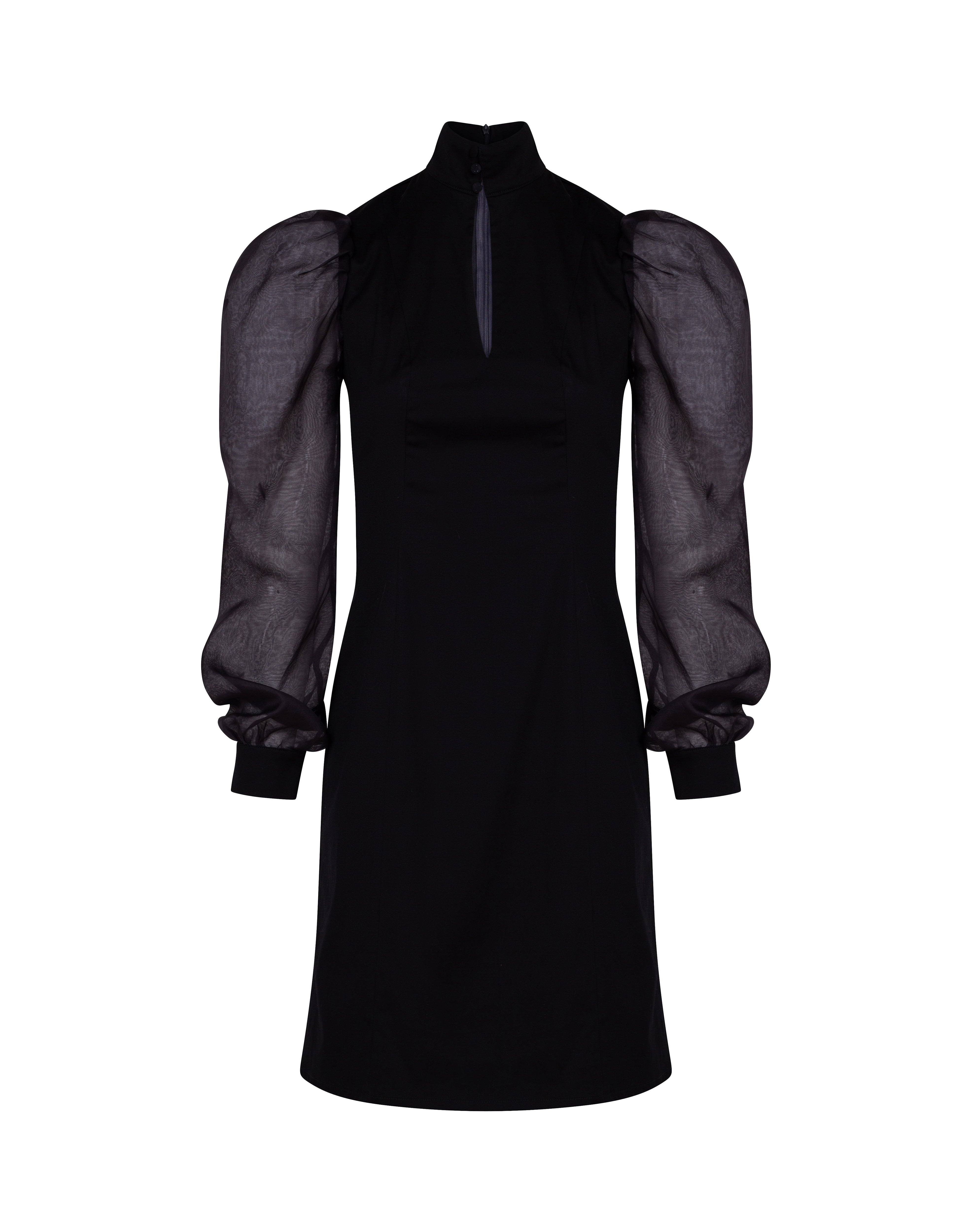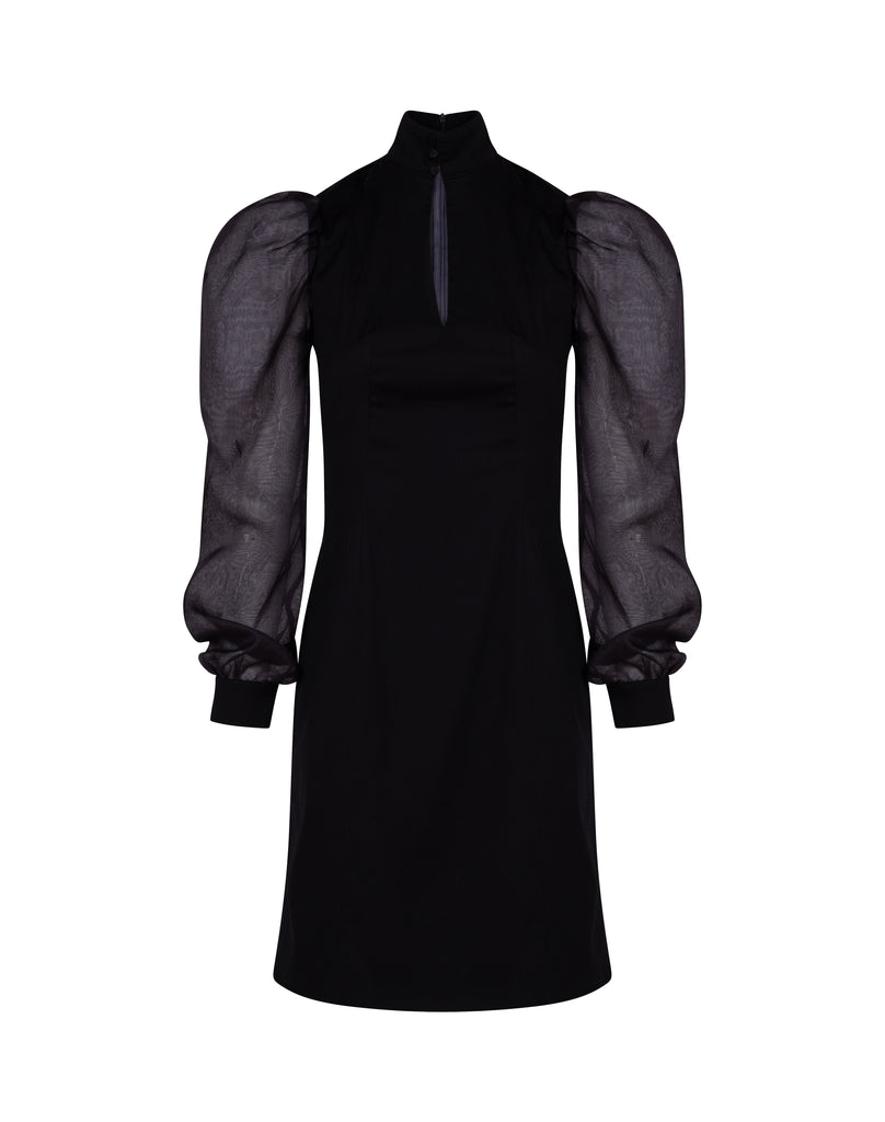 Robe longueur genou, près du corps, plaquée sur les hanches avec des manches ballon faite d'une double épaisseur d'organza de soie. Coutures anglaises. Fermeture par un zip arrière. Col tunisien avec patte de boutonnage autour du cou.