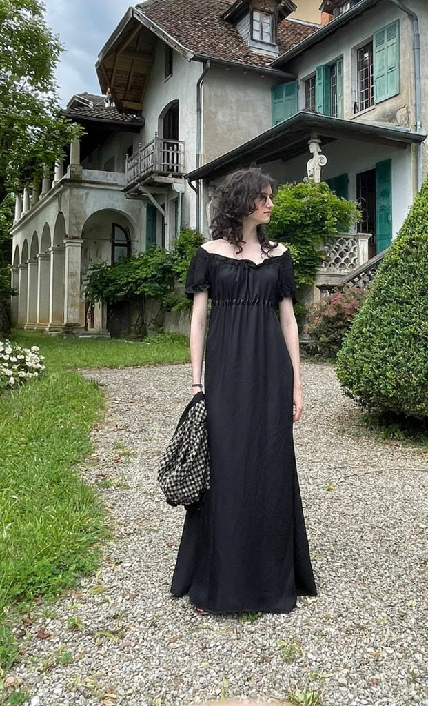 Robe empire dans une version soirée en soie, viscose ou satin. Selon les modèles, la taille est soulignée par un ruban en gaze et strass.