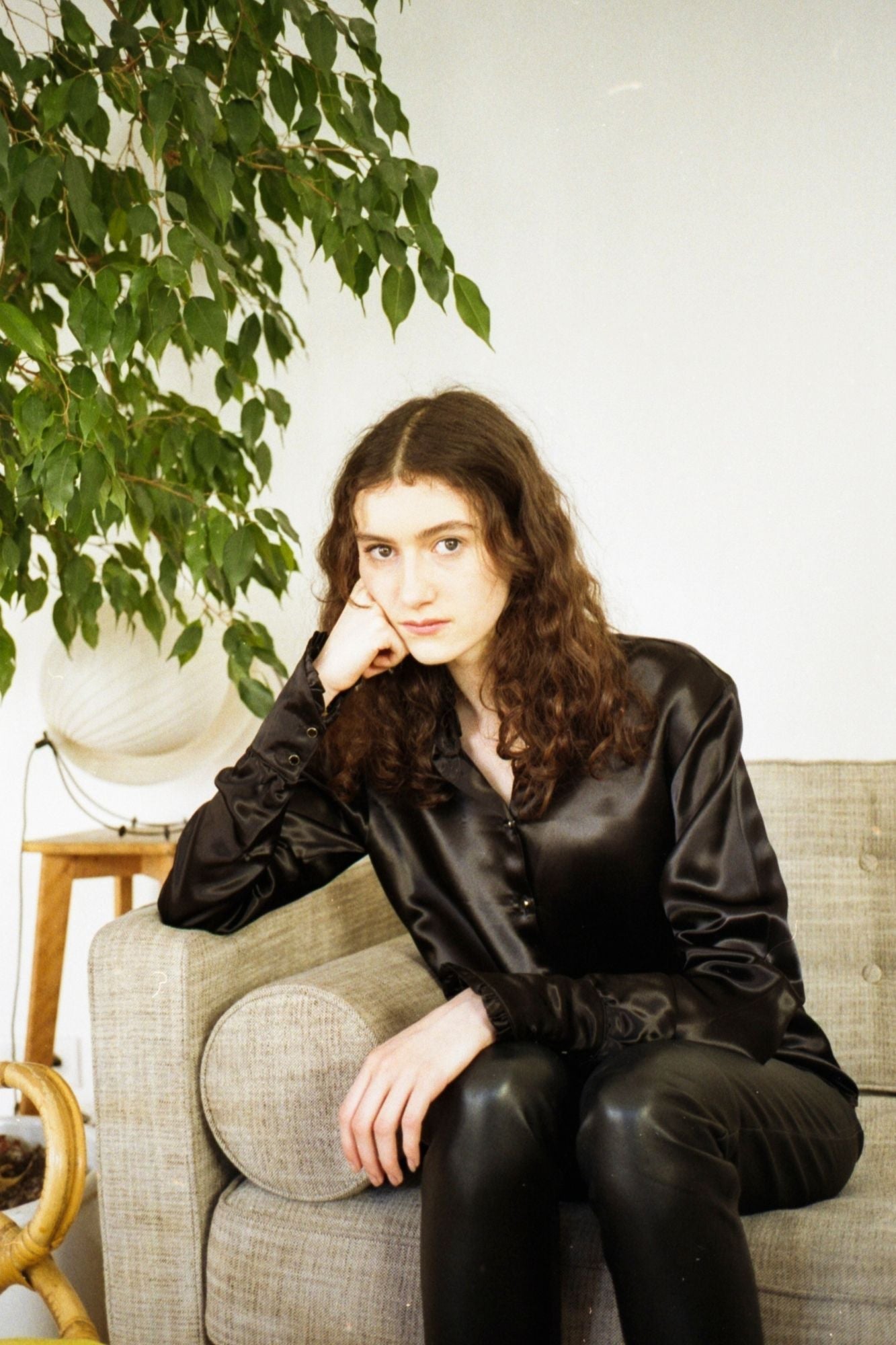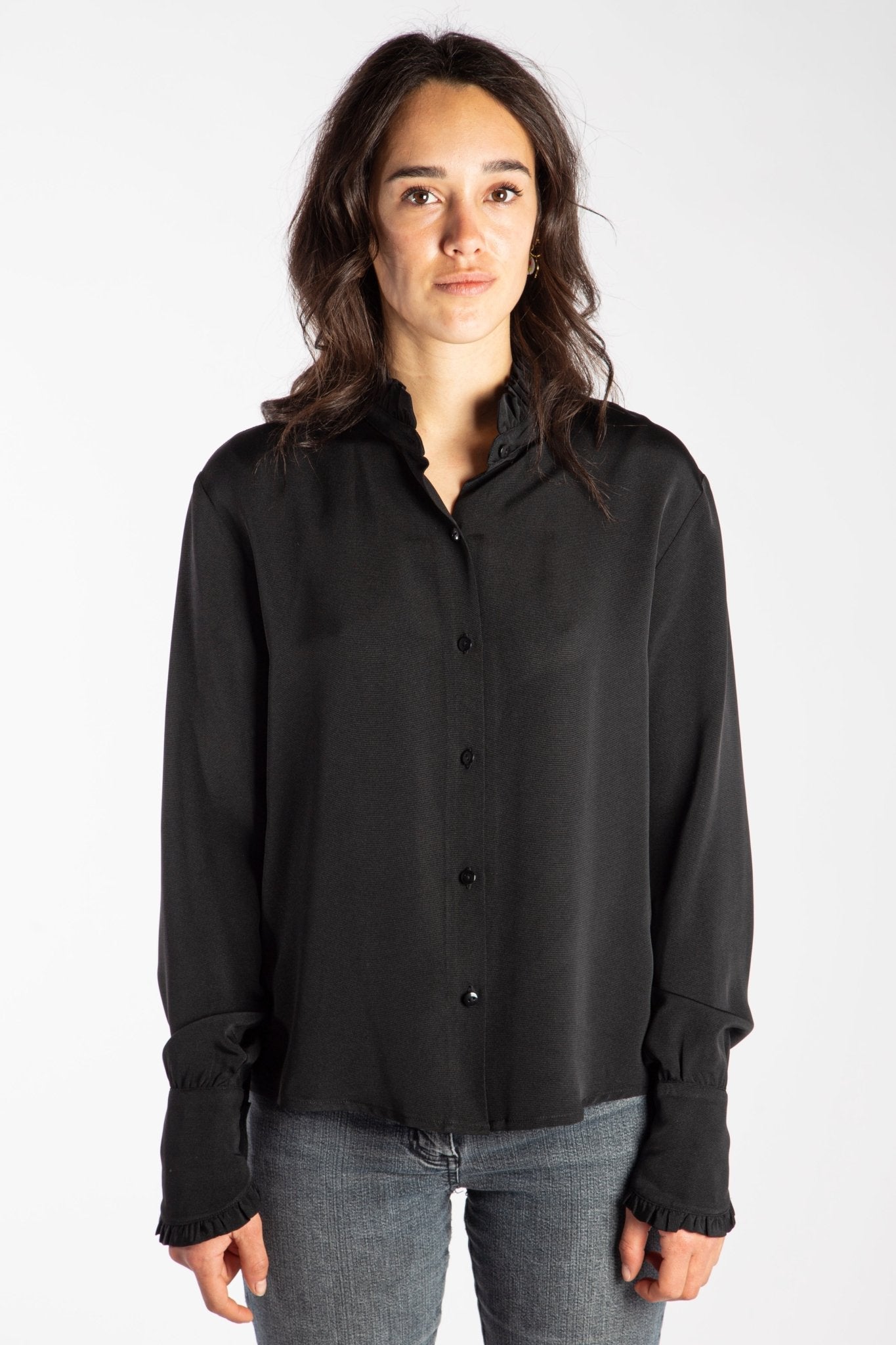 Coupe droite à col montant bordé d'un petit volant discret. Manches longues avec poignets arrondis bordés d'un volant, qui peuvent se porter dépliés sur la main ou repliés en poignes mousquetaires.