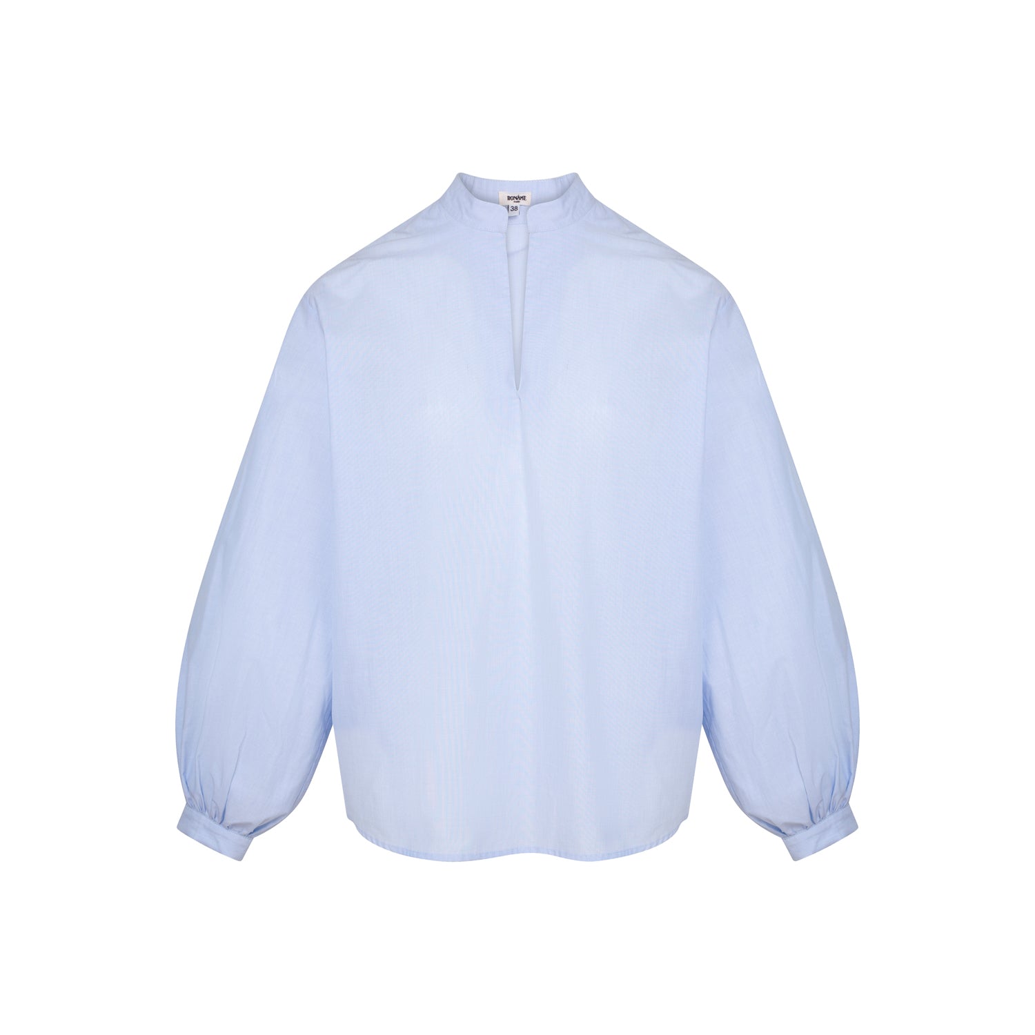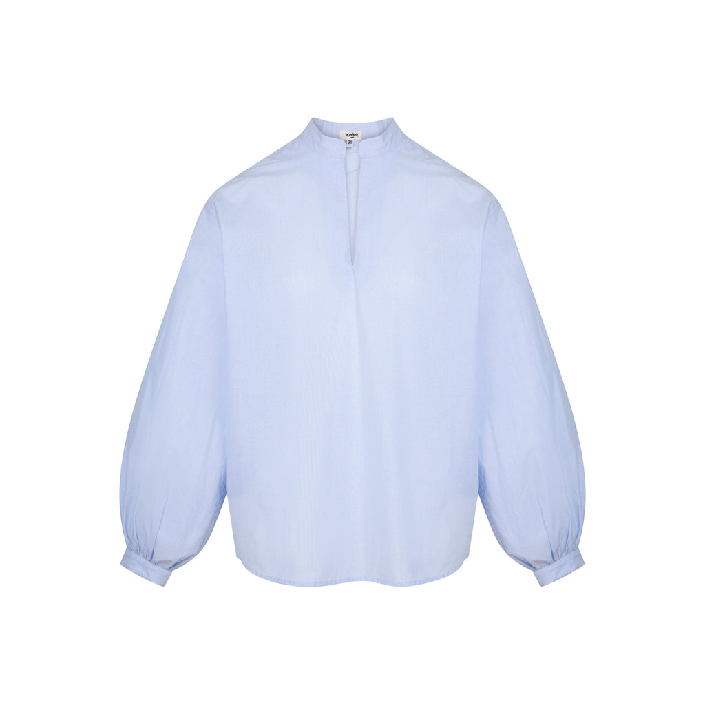 La blouse Sand est ample, avec les épaules tombantes et manches bouffantes resserrées aux poignets, sans col (juste un pied de col), étroite ouverture en V au niveau de l'encolure pour un léger effet décolleté.